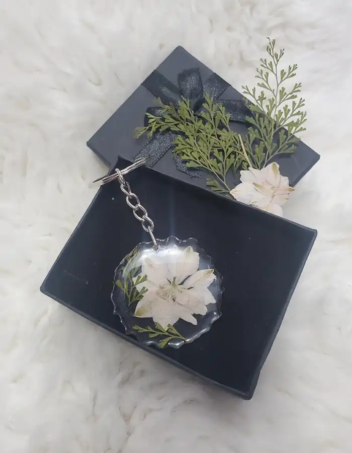 - Protective Receptacle and Stigmas: The keychain includes a receptacle that covers the entire piece, providing durability while highlighting the flower’s natural stigmas.