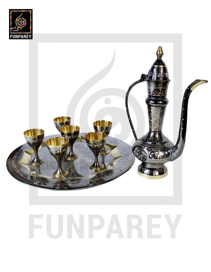 - This is a Set Product, comes with one Pitcher (Aftaba/Oftoba), 6 Chalices/Glasses and a Round Brass Tray (not shown in the picture).