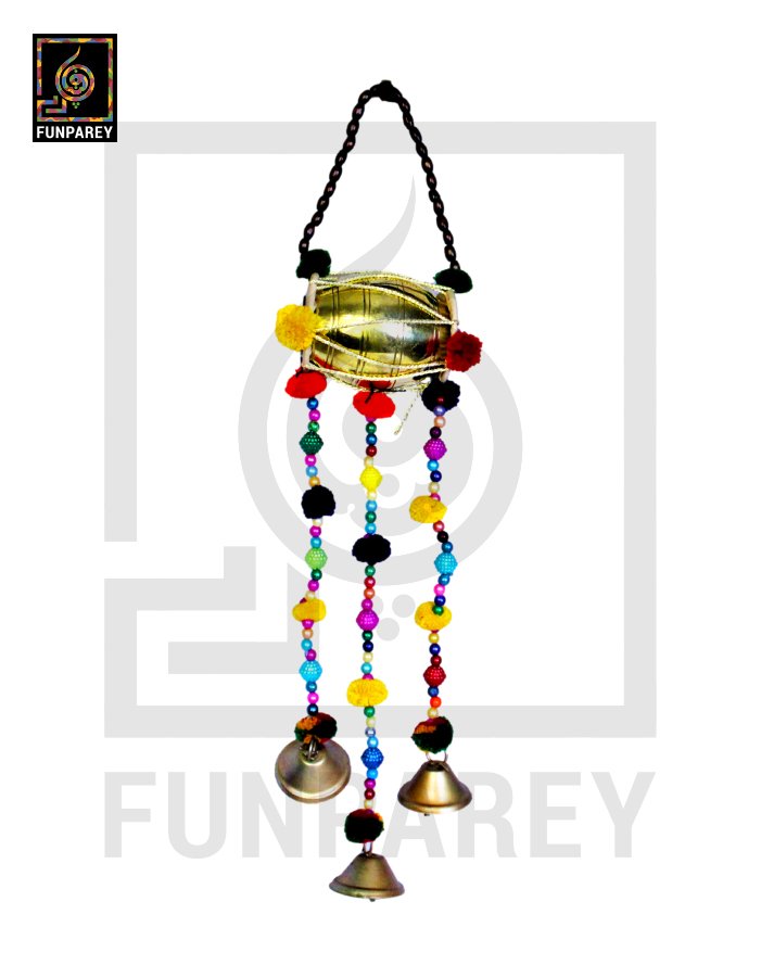 - Each Door Chime has a Whole Brass Drum / Dhol and also uses a combination of other materials such as Embroidered Fittings of fabric, Plastic Beads, Rexine leather, as well as Brass trinkets in its making.